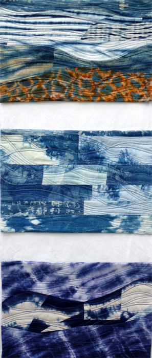 A productive weekend working on 'Green Door 2' and on next set of journal quilts - nothing like a deadline to focus the mind! This set of 3 were made entirely from scraps of other projects, and I had a fine time composing them. In interests of speed I quilted them all with twin needle stitching and I love the effects. They were put together with waves in mind but when I showed them to Ian he saw cliffs from Portland, mountains, sea spray. He's already 'dibbed' the second one for his office, praise indeed.