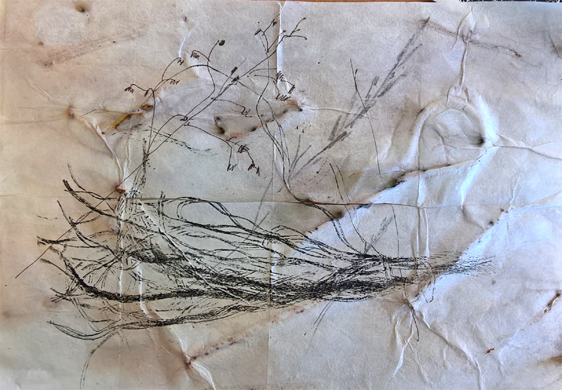 Most of the time I was just as happy with inking up a manky bit of rope and using a roller. Rather than doing one drawing over a whole opened up pamphlet, at Birling I'd drawn on it folded and consequently had a wider range of marks and layers (above) . The printing made an interesting addition to my drawings of grass shadows (on which I'd also carried out some rust printing ( below)