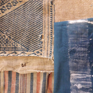 I bought some lovely bits of tattered and darned antique indigo and hemp from Sallie Ead to combine with my indigo dyed tea towels
