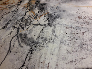 After the first couple of trips to my 'space' sometimes I combined the activity/prompt with the task ( saved throwing the dice, reusing the same number). As time went on and the layers accumulated, it becomes a bit tricky to remember what I did and when! But then the process became more about responding to the cloth itself and making changes - I'll show the evolution of some areas in another post but meanwhile , the photos below show some of the ways I interpreted the 'tasks'.