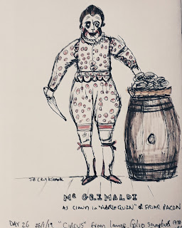 Well I drew every day as part of the #30daysketchbookchallenge19 , looking forward to receiving the prompt, thinking imaginatively when it really wasn't my thing ( but that's the point of a 'challenge'). Seeing what everybody else was doing on the Facebook page ( nearly 3K participants!) and on Instagram was inspiring and it was great to get feedback. Most of all , I welcomed having something to focus on for 20 to 30 minutes in a challenging few weeks of dealing with aftermath of flooding from the shower ( the workmen were working on all 3 floors , the only place to escape to was the kitchen). With my studio out of use and limited access to computer, I've mainly been using my phone to record my sketches and post on social media.